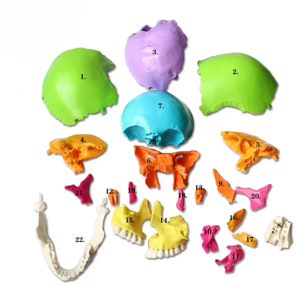 All 22 bone blocks are divided into 9 different colours to facilitate teaching. Paired bones are the same colour.